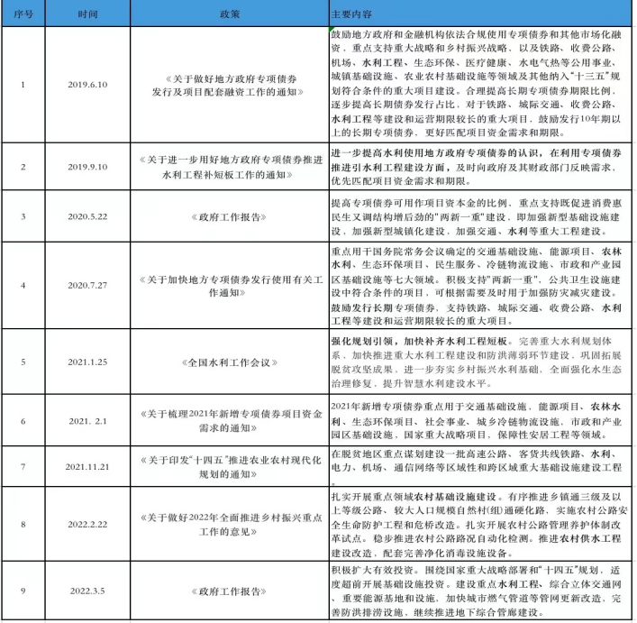 2022年3月5日,李克強在政府工作報告中提出,今年著力穩(wěn)定宏觀經(jīng)濟大盤,保持經(jīng)濟運行在合理區(qū)間。要用好政府投資資金,積極擴大有效投資。圍繞國家重大戰(zhàn)略部署和“十四五”規(guī)劃,適度超前開展基礎(chǔ)設(shè)施投資。建設(shè)重點水利工程、綜合立體交通網(wǎng)、重要能源基地和設(shè)施,加快城市燃氣管道等管網(wǎng)更新改造,完善防洪排澇設(shè)施,繼續(xù)推進地下綜合管廊建設(shè)。今年擬安排地方政府專項債券3.65萬億元,強化績效導(dǎo)向,堅持“資金跟著項目走”,合理擴大使用范圍,支持在建項目后續(xù)融資,開工一批具備條件的重大工程、新型基礎(chǔ)設(shè)施、老舊公用設(shè)施改造等建設(shè)項目。