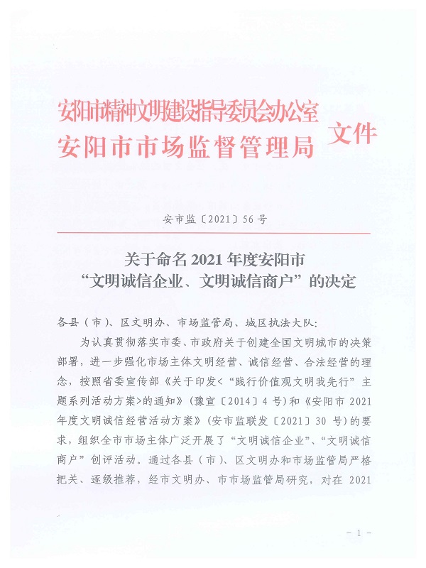近日,安陽市市場監(jiān)督管理局、安陽市精神文明建設(shè)指導(dǎo)委員會辦公室聯(lián)合印發(fā)了2021年度安陽市“文明誠信企業(yè)、文明誠信商戶”的決定(安市監(jiān)[2021]56號),我公司榮獲2021年度安陽市“文明誠信企業(yè)”榮譽稱號。