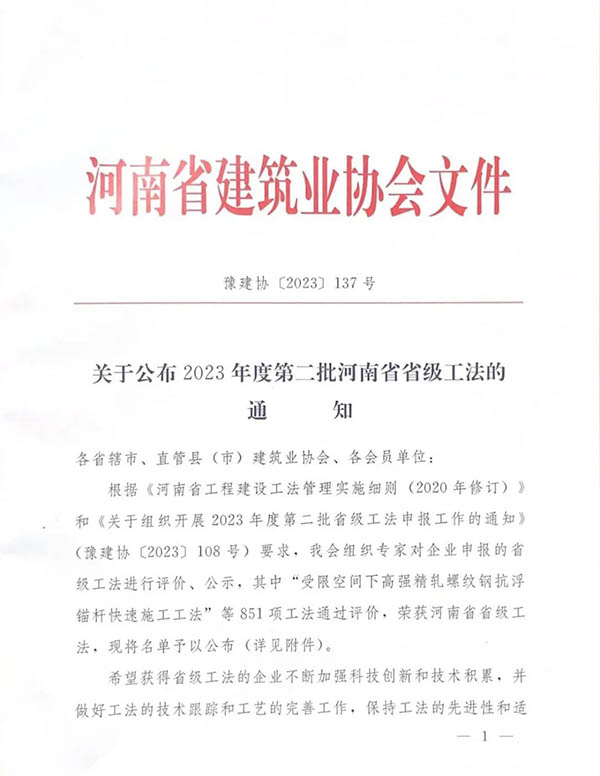 榜上有名| 2023年度第二批河南省省級工法獲獎名單公布